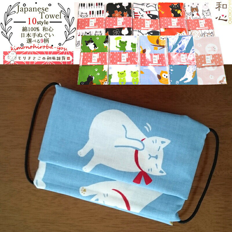 日本製 和心 Wa Gokoro 日本手ぬぐい 全10柄 綿100 もりまさこ 和風雑貨 和柄 動物柄 手作りマスク生地 てぬぐい 手拭い 手ぬぐい 猫 柴犬 桜 フクロウ ふくろう カエル かえる 蛙 うさぎ 猫柄 ピンク 白 緑 みどり 青 黒 水色 オレンジ